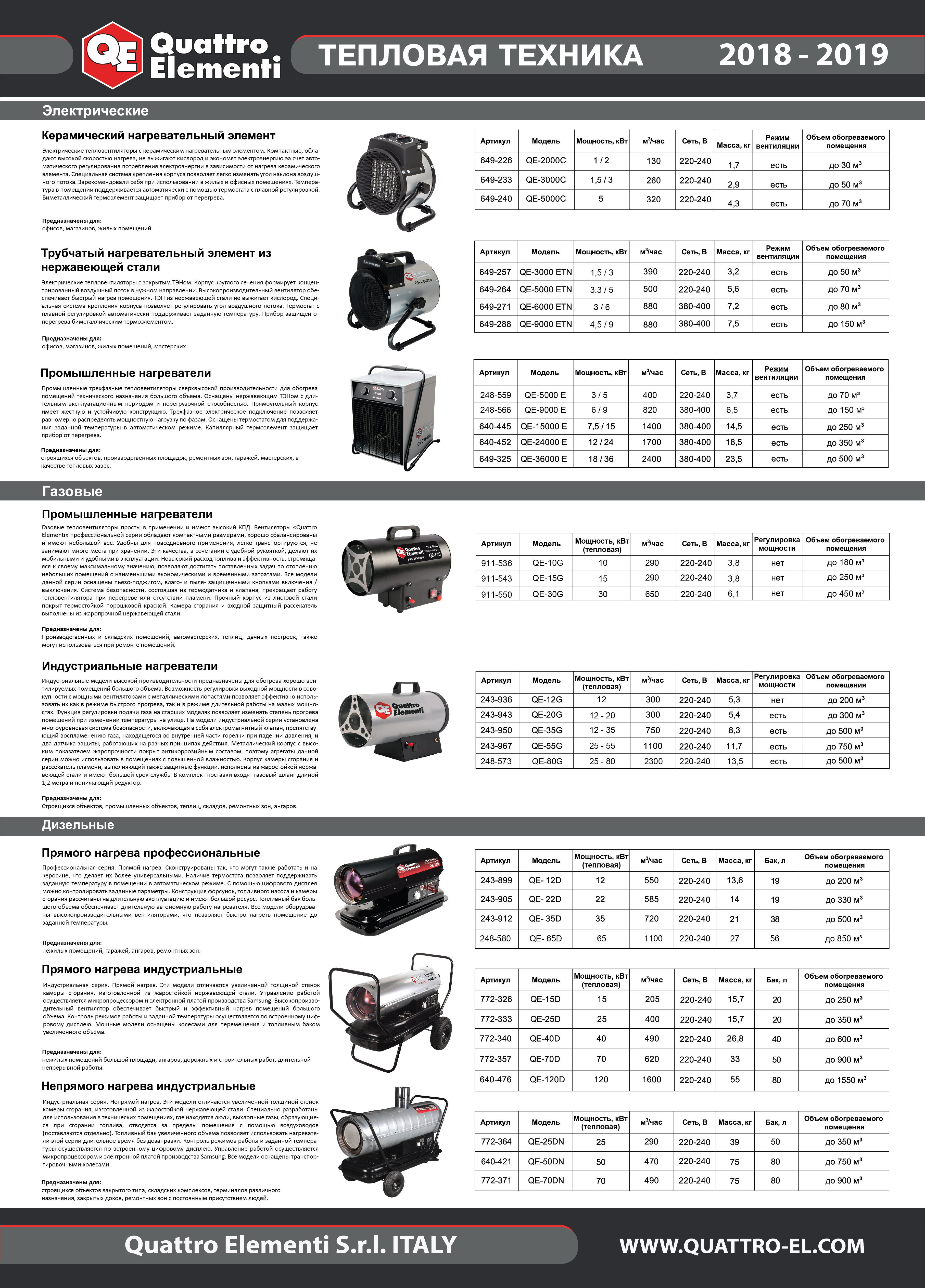 Quattro Elementi - Нагреватель электрический с ТЭН QUATTRO ELEMENTI QЕ-24000 E (12,0/24,0 кВт, 380В-3ф, 1700 м3/час) - цена, фото, технические характеристики, деталировка